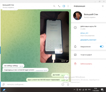 2 мая 2023 года была совершена сделка со Sten_001 я купил у него дебетовую карту, но без отправки, чтоб время не терять просто доступ до приложения сделали и добавили карту в Mirpay, (из сути переписки можно увидеть что оплатить я ее смогу только с этой же карты когда туда упадет сумма), первая сделка сорвалась я уведомил Sten_001, 11 мая, 13, 14, Sten_001 не читал мои сообщения 15 числа вышел на связь и дал реквизиты куда оплатить, 16 мая я оплатил ему за карту, сама карта сим и весь комплект был у него, у меня просто доступ до приложения и MirPay, при снятии денег банкомат запросил смс с номера привязаного к карте которая у Sten_001, когда я спросил когда сможешь сказать смс он сказал вечером время был обед, и после этого разговора меня выкинуло с приложения, вечером когда Sten_001 добрался до сим карты сказал что смс на нее не приходят, в 21:19 звонил дропу, 21:21 сказал что номер заменила в банке дроп, все время ссылается на то что деньги во время ей не отдали. хотя договор то про карту был со Sten_001 и все обговарилось с ним, в общем 530 000 руб на карте, доступа со слов Sten_001 нету.