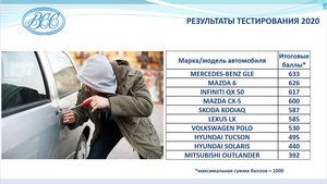 Исследования проводили в соответствии с методическими материалами «Критерии и методика оценки эффективности штатной защиты автомобиля от угона», разработанными ВСС. Там объяснили: подобные рейтинги составляются в ряде западных стран, но для России они не подходят, поскольку угоны в России имеют свою специфику. Эксперты оценили пять параметров: насколько защищены двери кузова, капот, крышка багажника, остекление кузова и эффективность штатных сигнализаций. По всем этим параметрам в совокупности каждая модель могла набрать до 1000 баллов.