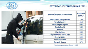 «Проверка штатных систем сигнализации состояла из оценки ее срабатывания при попытке злоумышленников открыть двери, капота и багажник, а также работы настроек памяти противоугонки, — объяснил один из авторов рейтинга. — Так, если сигнализация сработала, а злоумышленники сначала отключили клеммы аккумулятора, а потом подключили их обратно, сигнализация должна была продолжить работу».