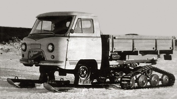 Были и проекты гусеничных УАЗов, которые разрабатывались с начала 60-х годов! Так, зимой 1963 года начали испытывать экспериментальный УАЗ-451С, вместо передних колес которого были установлены лыжи, а задние ведущие колеса были заменены на гусеничные движители. И зимой 1966 года пробные образцы даже дошли своим ходом от Новосибирска до Ульяновска. В 1968 году появился доработанный УАЗ-451С2, у которого лыжи ставились прямо на передние колеса, что сокращало время подготовки к выходу на бездорожье. Однако ни первый, ни второй вариант в серию так и не пошли.