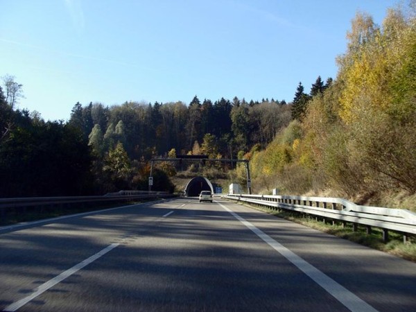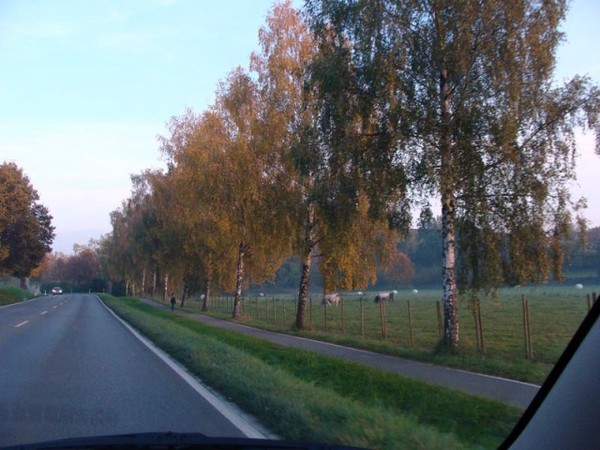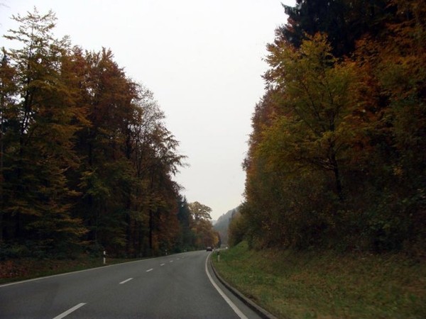 Дорога через лес между городами. Светоотражающие столбики, бордюр и прочие ненужные русскому человеку вещи.. Дорожная разметка у них тоже не как у людей. Во-первых она светоотражающая. Во-вторых, при наезде на разметку шинами, раздается неприятный звук (это чтобы засыпающий водитель, выехавший на встречную или на обочину проснулся в ужасе). В-третьих частенько полоса вдоль обочины покрыта маленькими полусферами - всё с той же целью: чтобы заснувший водитель проснулся от тряски. В принципе в этой местности очень сильные туманы.