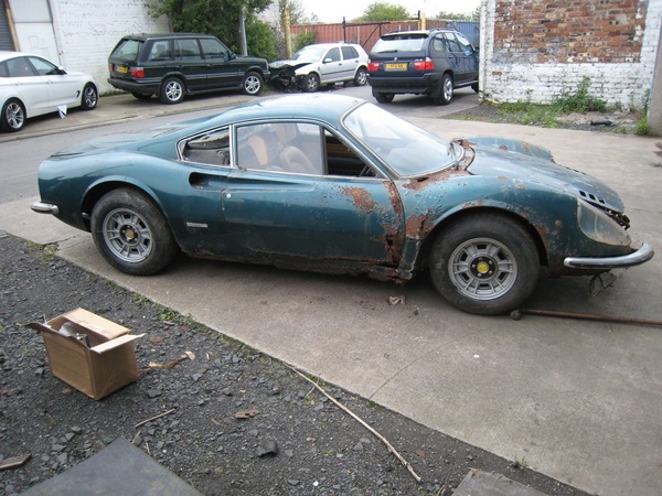 Непревзойденный Феррари Дино не так давно нашли в самом обычном гараже. Всего 2 владельца и пробег 14.000 миль. Причем пробег всего за 2 года, а потом тоска и печаль, уныние и влажность с 1975 года, которые превратили автомобиль чуть ли не в ржавую труху.