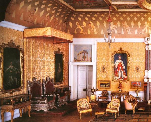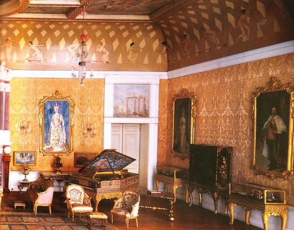 парадный зал, в котором стоят трон и огромное пианино, стены обиты шелком, шелковое настенное покрытие соткано в невероятном масштабе: 120 нитей на один дюйм. Эта комната расположена на втором этаже.