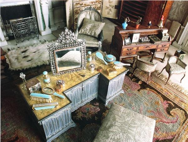 Спальня Королевы более камерная, и по-женски мягкая, в приглушенных тонах, с изысканным туалетным столом.