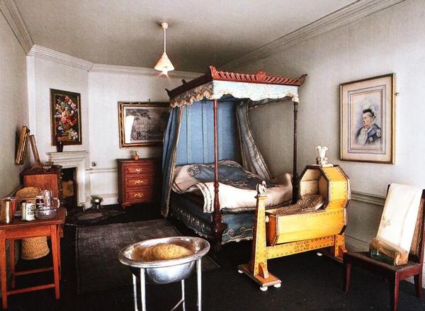 Комната принца Уэльского. Колыбель из яблони и слоновой кости украшена крошечной фигуркой ангелочка. Есть стульчик для кормления, крохотная купальня и место для няни.