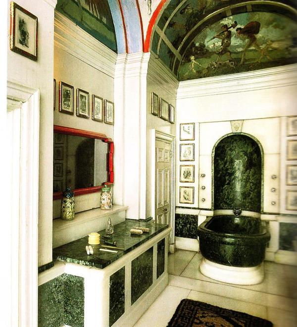 ванная комната, выполненная строго и вместе с тем роскошно, стены отделаны темно-зеленым мрамором, сорта Verdite, на ванне шесть крошечных кранов с настоящей водой, душем и брызгами. Столешница умывальника из того же зеленого мрамора. На полке белого мрамора — бутылки соли для ванн. Потолок украшен росписями, а стены украшены миниатюрами из мультфильма «Punch», авторы Бернард Партридж и Л. Ворон-Хилл. Есть крохотные полотенца размером 1 к 12, куски мыла размером с горошину, лак для ногтей и губки.