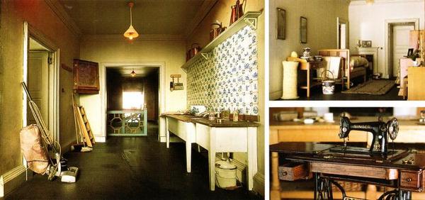 служебные помещения — комната портнихи, комнаты горничных, с множеством принадлежностей для уборки, гладильная комната. И даже здесь все по-взрослому: швейная машинка Зингер, модель полностью рабочая. Катушки с нитками не больше спичечной головки и есть шесть десятков этих бабинок. Здесь же плетеные корзины для белья, в которых находятся полотенца, подушки и другие вещи домашнего текстиля, все помеченные королевской монограммой.