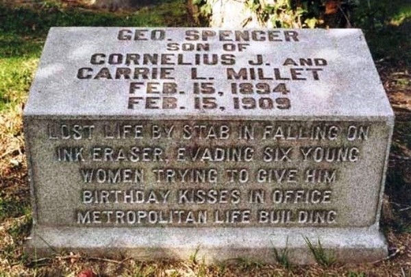 Эпитафия Джорджа Спенсера Миллета на кладбище Вудлон в Нью-Йорке в странности не уступает обстоятельствам смерти несчастного подростка. «Погиб, упав и напоровшись на скребок для чернил, когда убегал от шести девушек, пытавшихся поцеловать его в честь дня рождения в офисе Метлайф-Билдинг».