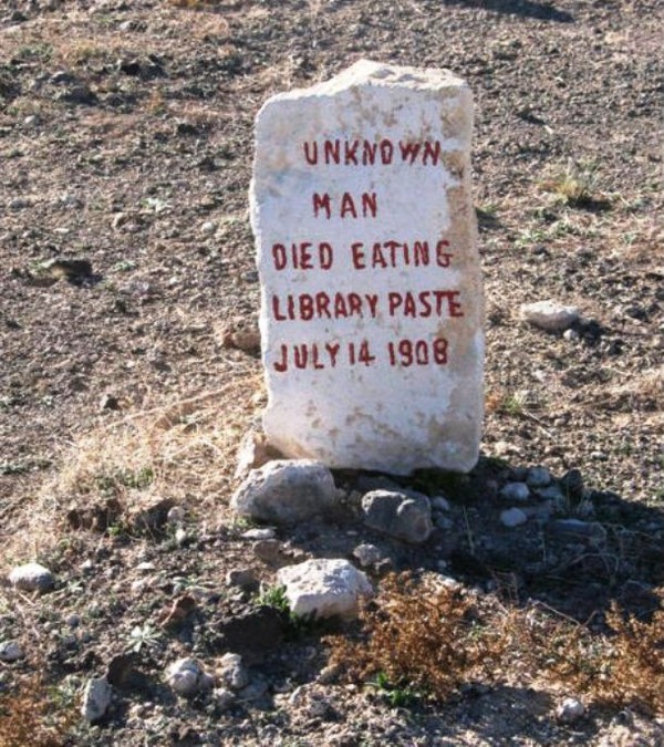 «Неизвестный, умер от поедания клейстера». Эту странную эпитафию можно увидеть на кладбище города Голдфилда в штате Невада. Употребление клейстера в больших количествах действительно может привести к смерти, поскольку он содержит ядовитые алюминиевые квасцы.