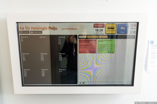 Сенсорный экран, который висит внутри одного из подъездов. С его помощью жители могут получить различную информацию – прогноз погоды, расписание мероприятий, которые проводятся в их доме, или расписание автобусов (Указаны все ближайшие остановки и через сколько куда приедет автобус. Прямо перед выходом из дома можно увидеть, надо ли бежать к остановке, или можно спокойно прогуляться).