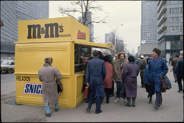 Киоск с логотипами Snickers, Mars и M&M’s на проспекте Калинина (сейчас улица Новый Арбат), Москва, 1993 год.