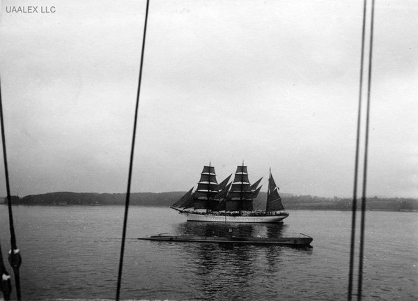 Перед парусником германская подводная лодка Ю-33. Вошла в строй в 1936 году и была потоплена в 1940 году британским тральщиком. С 42 членов экипажа 25 погибли