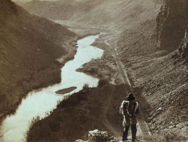 Индеец смотрит на построенный участок Tрансконтинентальной железной дороги, 1868 год, США