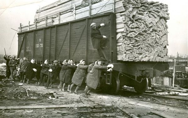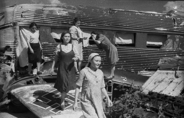 Временное жилище в сбитых самолетах в разрушенном городе. Фюзеляж от Ю-52. 1943 г.