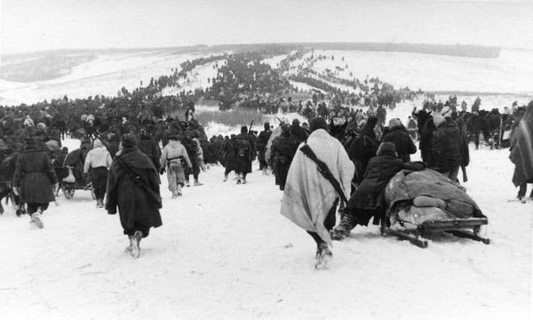 Собака в снегу, наблюдающая за колонной итальянских солдат из 8-й итальянской армии, марширующей к Сталинграду. СССР. 1942 год.