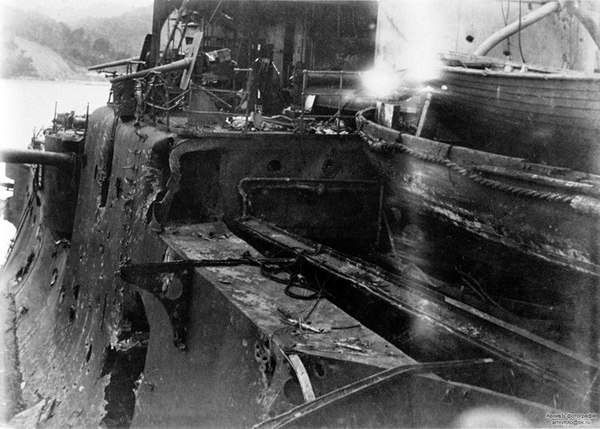 Эскадренный броненосец «Орел» после Цусимы, 1905 год. В сражении получил от 76 до 140 попаданий. Был восстановлен и модернизирован японцами и вступил в строй Императорского флота Японии под названием «Ивами»