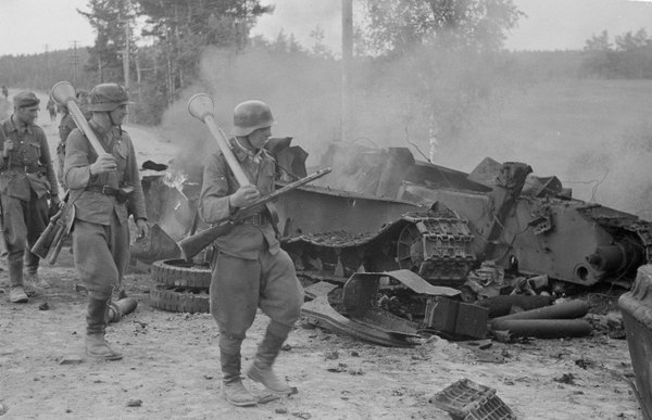 Финские солдаты из 12-го полка 2-й дивизии — (слева направо) рядовой Эйно Хейккила (Eino Heikkilд), сержанты Калле Ниемела (Kalle Niemelд) и Хейно Никуласси (Heino Nikulassi) — проходят мимо разрушенного взрывом советского танка Т-34, по дороге к Тали-Ихантала (Tali-Ihantala) на Карельском перешейке, 1944 год. Солдаты вооружены гранатометами «Панцерфауст» (Panzerfaust) и финским автоматом Suomi KP/-31.