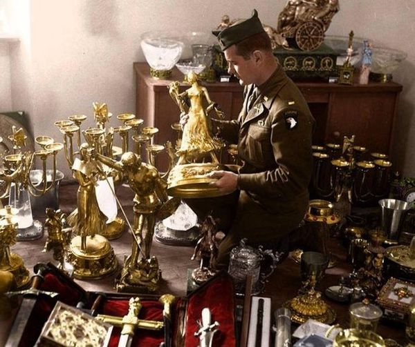 Американский солдат рассматривает статуэтку из чистого золота в тайнике Германа Геринга, найденном 7-й армией в пещере рядом с Шонау ам Кенигзее, Германия, 25 мая 1945 года.