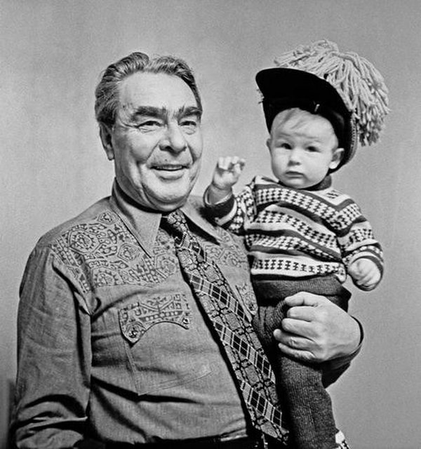 Генеральный секретарь ЦК КПСС Леонид Ильич Брежнев с правнучкой Галей, 1973 г. Рубашка генсека имеет американское происхождение, а вот шлем на ребенке явно подарок из Англии