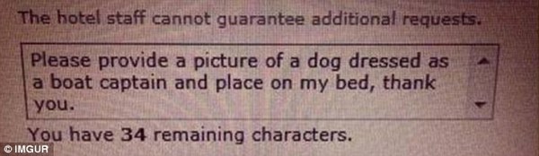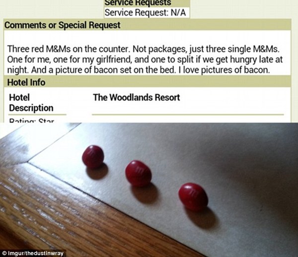 Некий бизнесмен, предположительно из США, находящийся в постоянных разъездах, развлекает себя, оставляя странные просьбы в графе "дополнительные пожелания" при бронировании отелей. И что удивительно, каждый раз его пожелания выполняются. Видимо, у отельеров тоже есть чувство юмора.
