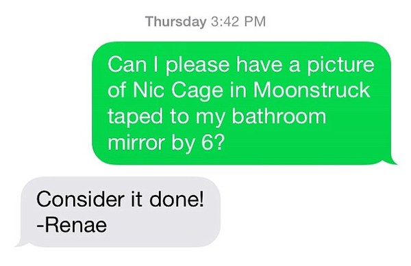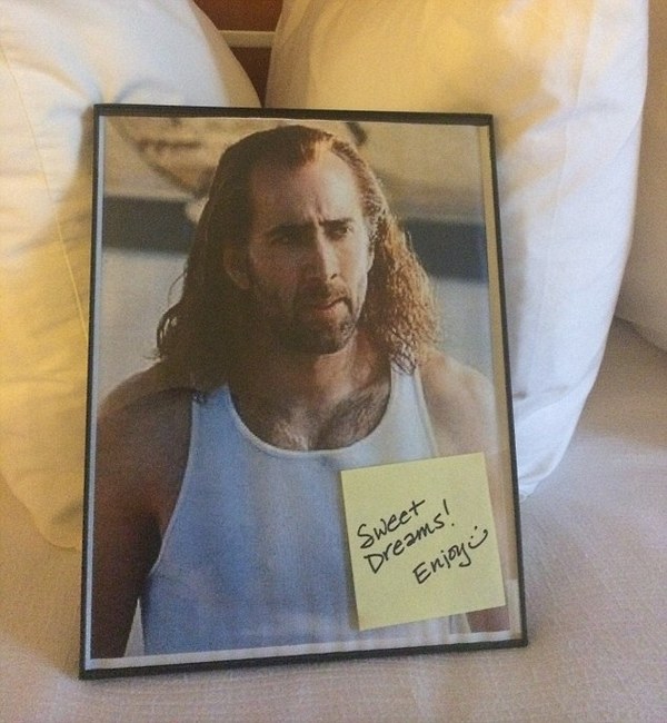 Следующая просьба: "Не могли бы вы приклеить фото Ника Кейджа из фильма "Во власти луны" на зеркало в ванной к 6?