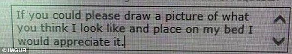 В следующей гостинице он попросил персонал отеля немного пофантазировать и попросил "если сможете, не могли бы вы нарисовать картинку того, как я по-вашему выгляжу, и положить мне на кровать, буду признателен".